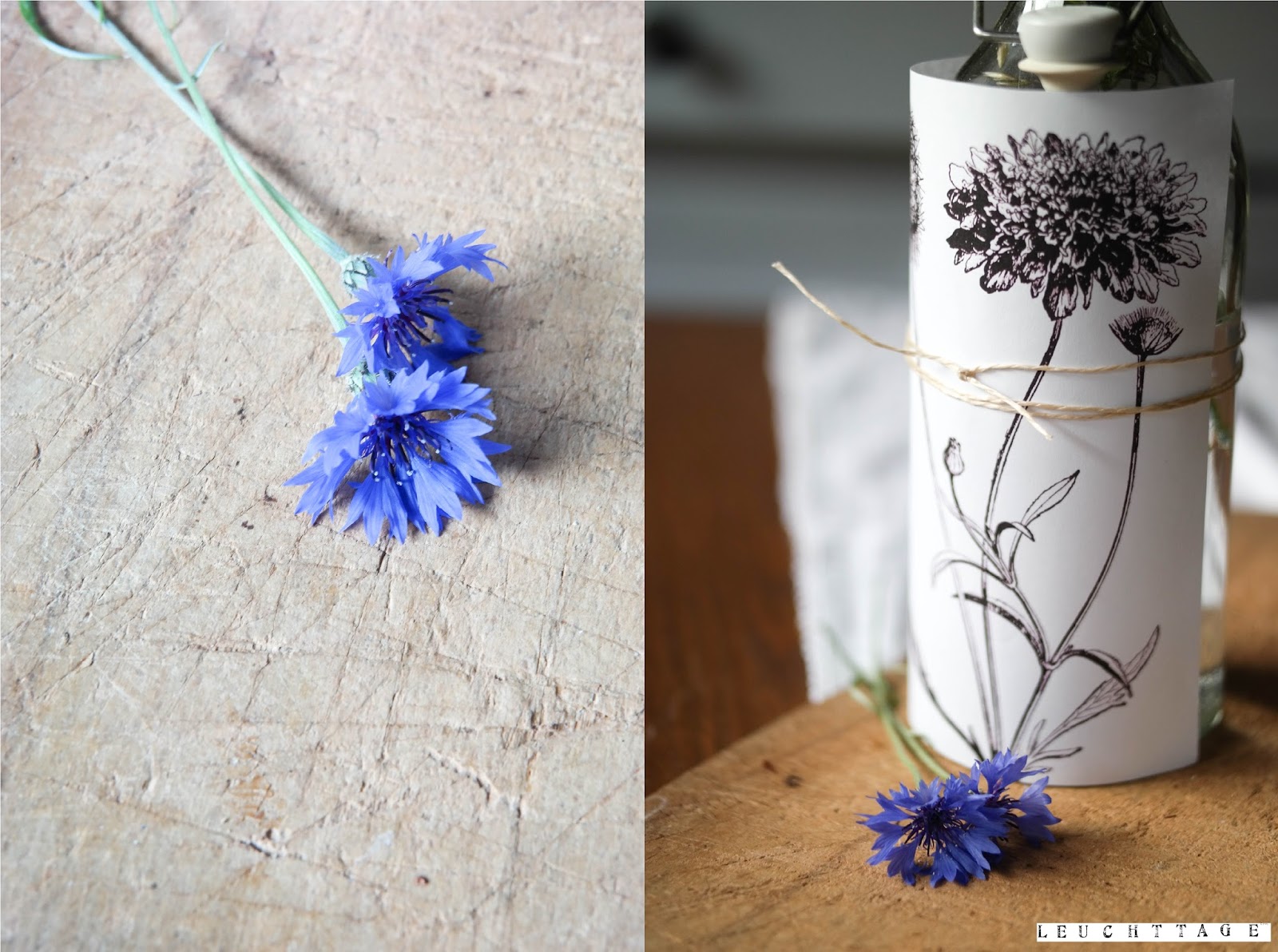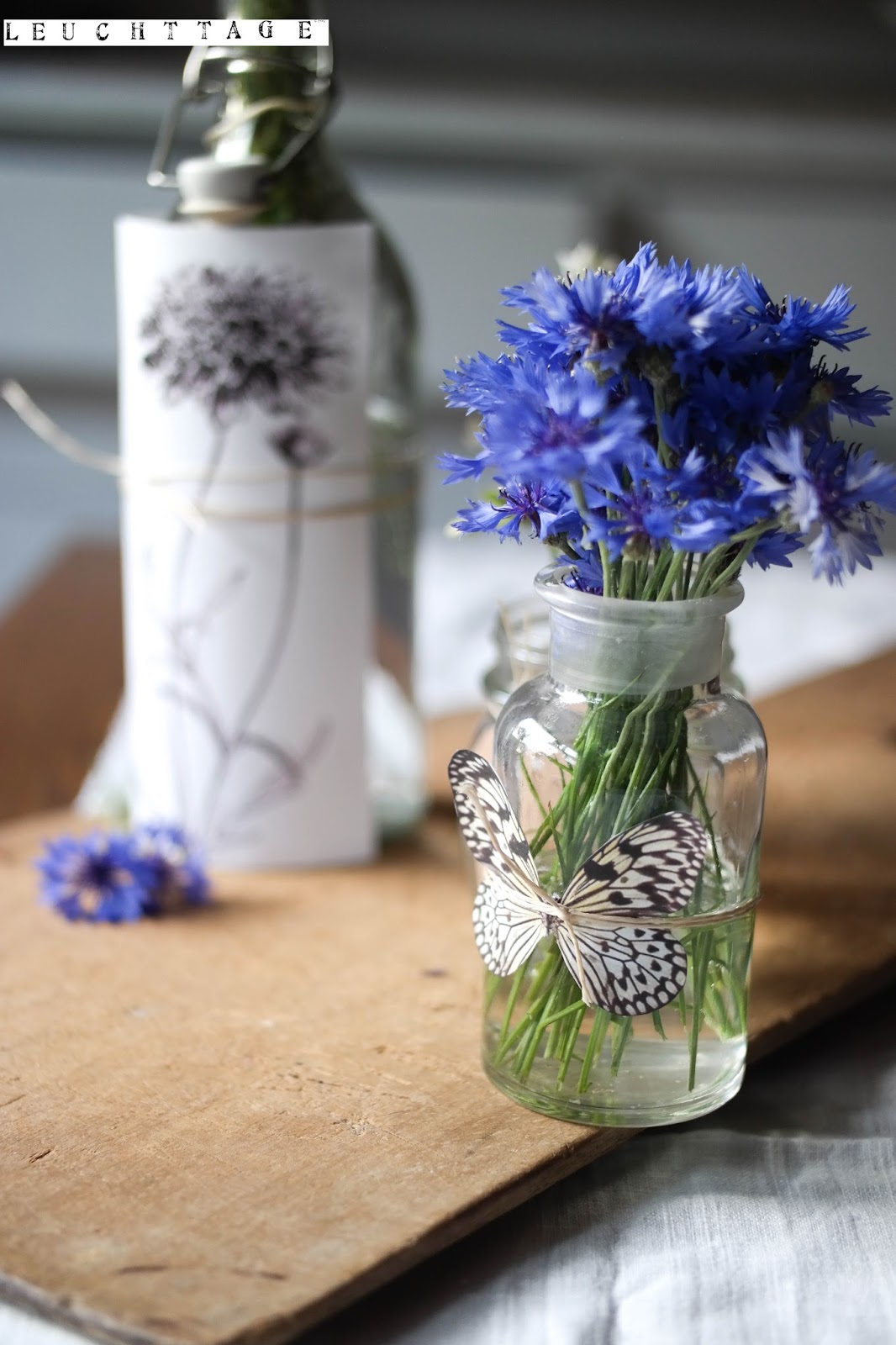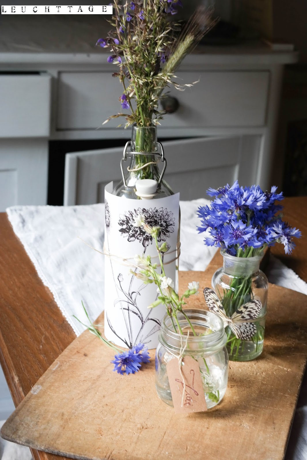 Die schönen Drucke für die Flaschen ( Pflanze und Schmetterling) habe ich hier gefunden- ein wahrer Fundus an tollen Dekoideen ! Das Blau der Kornblumen ist so schön, ich freue mich jedes Mal, wenn ich daran vorbei laufe 🙂