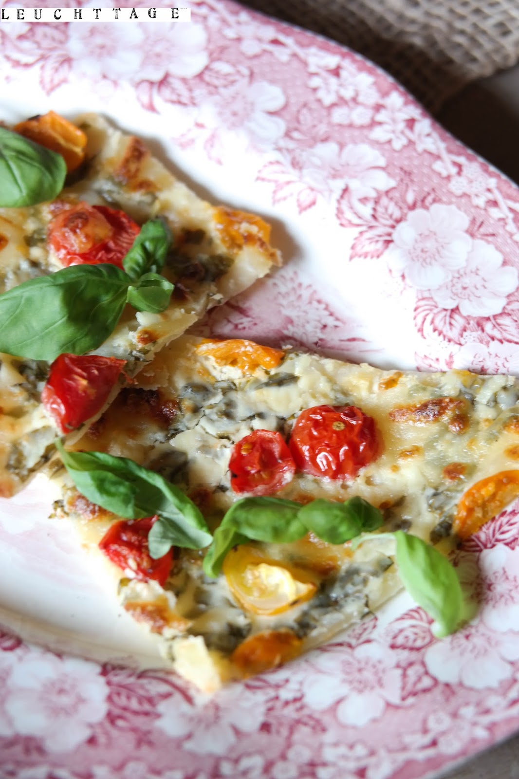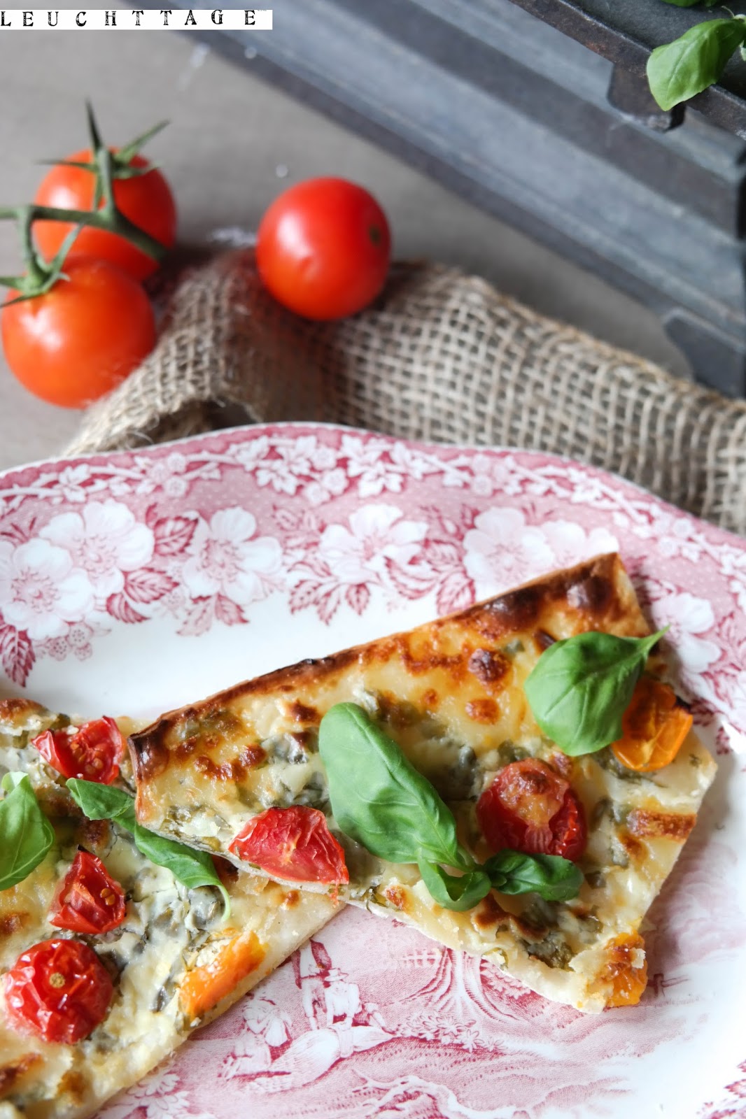 Teig entrollen und auf ein Backblech legen. Schmand mit kleingehacktem Basilikum verrühren und auf den Teig streichen. Mit den Tomaten belegen und mit gewürfeltem Mozzarella belegen. Mit Salz und Pfeffer bestreuen. Bei 200° 15-20 Minuten knusprig backen- nach Wunsch mit frischem Basilikum belegen und servieren!