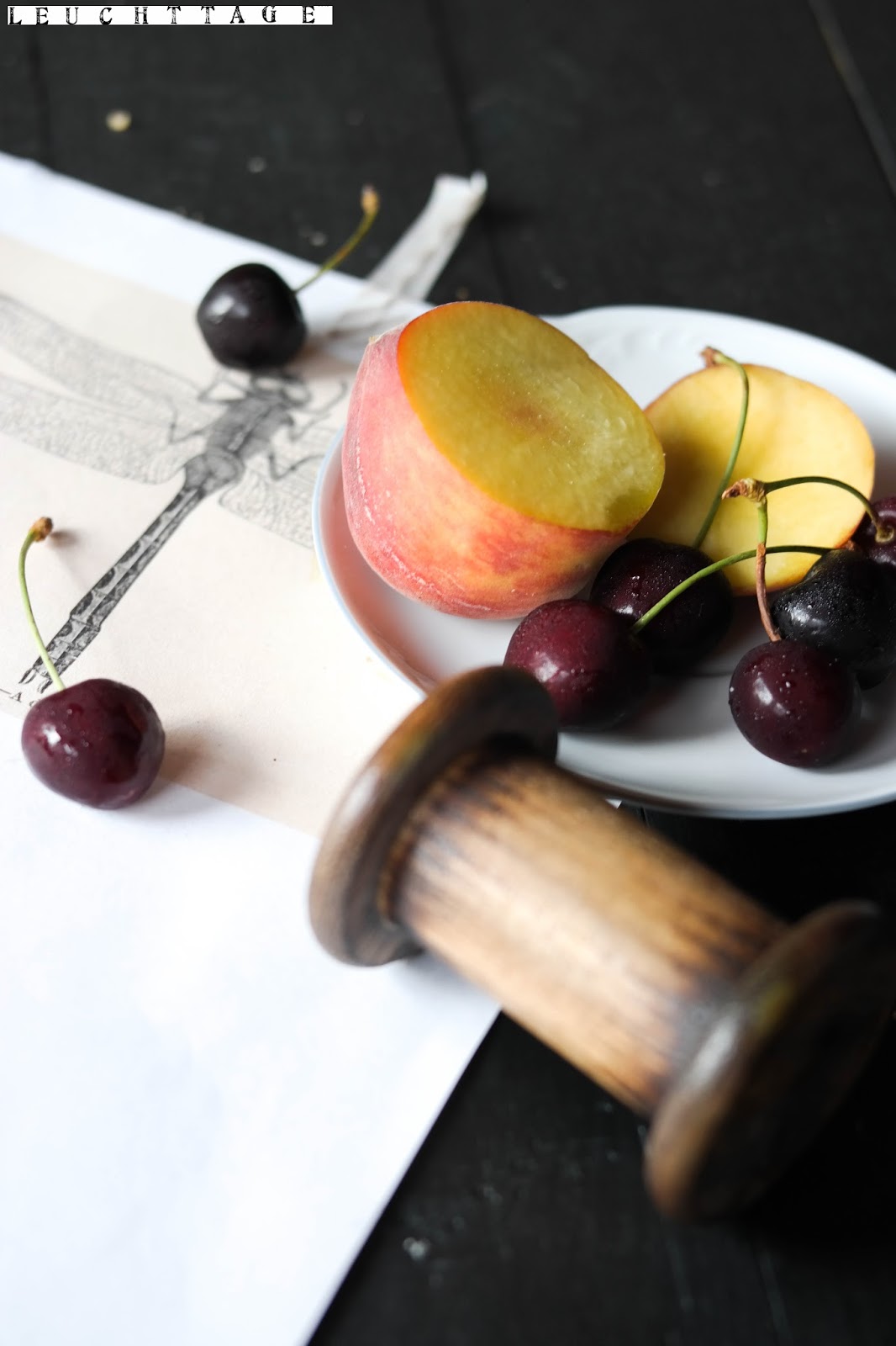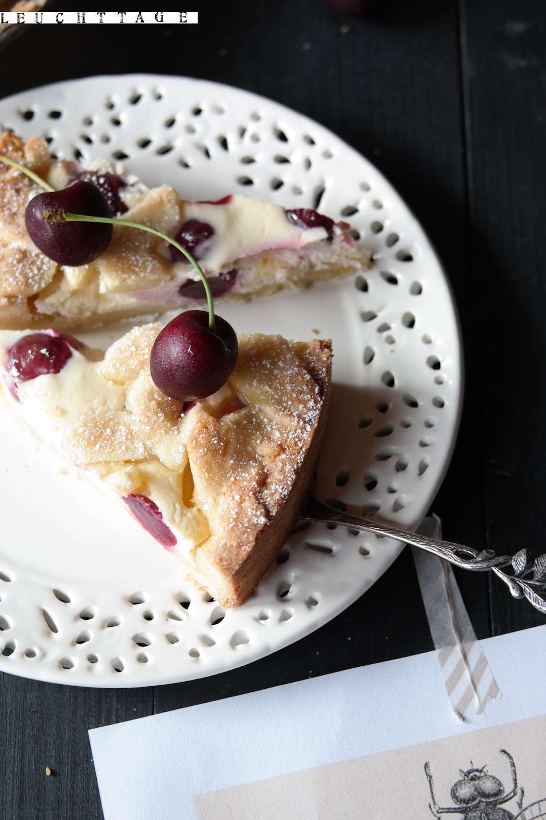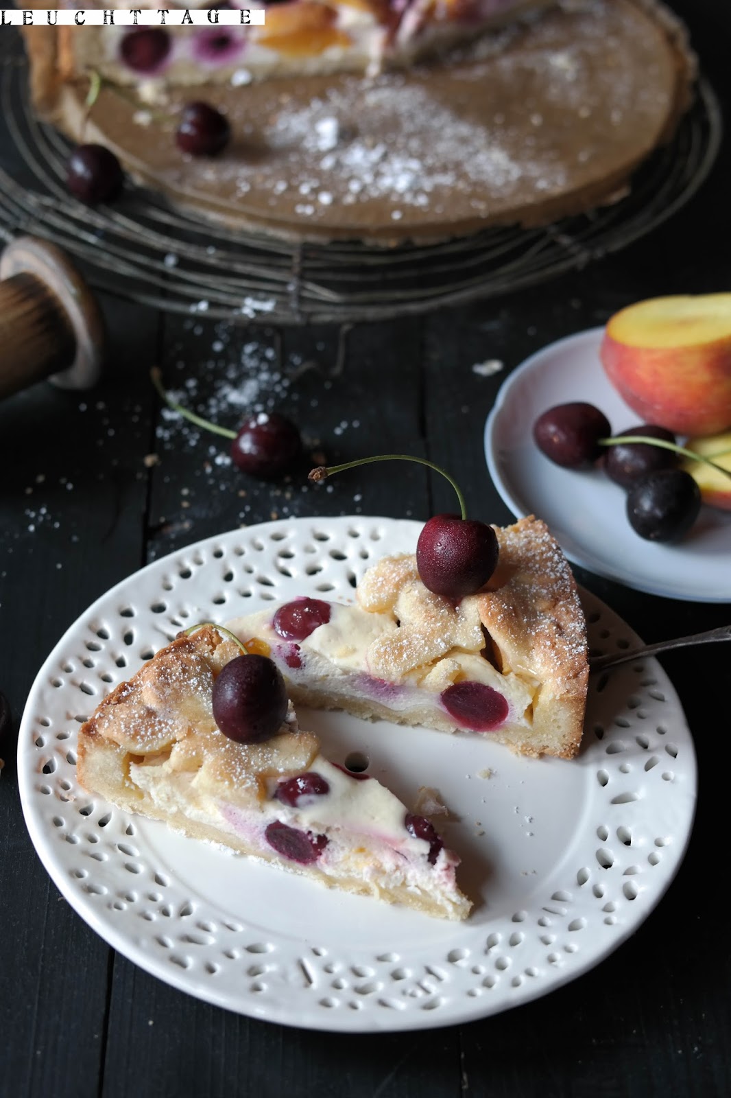 Und da hier noch ein paar Kirschen und Pfirsiche rumlagen und diese geradezu nach Obstkuchen schreiben- jedenfalls habe ich dieses Schreien vernommen- gab es noch einen saftigen Kirsch-Aprikosen-Kuchen mit einer leichten Quarkcreme, der ohne viel Zucker auskommt, dafür machen ihn die Früchte süß genug !