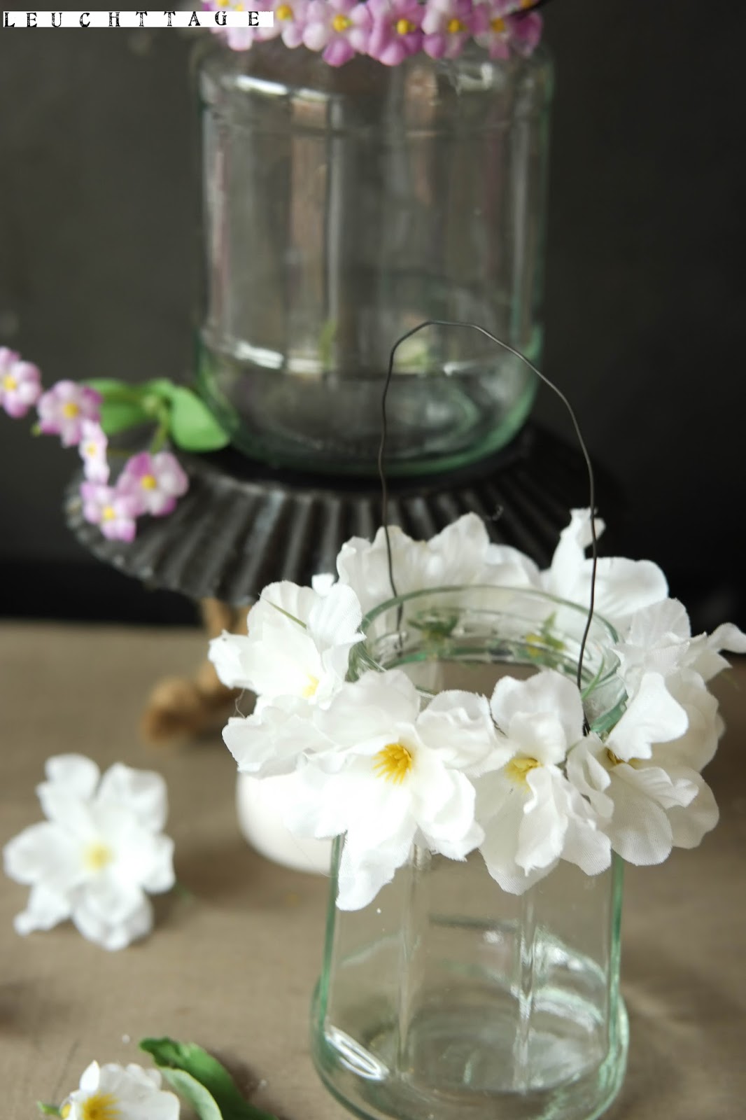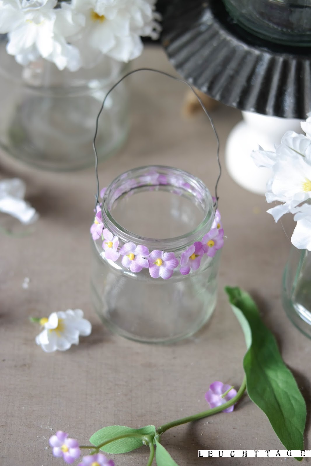 Auf der Suche nach nicht essbaren Alternativen für unsere Terrasse kam mir die Idee mit den Windlichtern- normalerweise bin ich kein Fan von Plastikblumen, aber dezent auf den Rand noch leeren Einmachgläsern geklebt, welche zuvor mit Henkeln versehen wurden, sehen sie täuschend echt aus, und tata, daran wird sich wohl hoffentlich keine Schnecke zu schaffen machen !