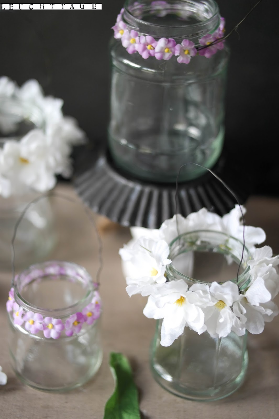 Alles, was ihr dafür braucht, sind leere Einmachgläser, abgeschnittene Plastikblumen, Heißklebepistole und biegsamer Draht. Aus letzterem biegt ihr Henkel und einen Drahtring, welchen ihr um die Öffnung des jeweiligen Glases biegt. Daran befestigt ihr den Henkel. Jetzt nur noch mithilfe der Heißklebepistole die Blumen am Glasrand befestigen- und schon habt ihr einen schönen Eyecatcher geschaffen!