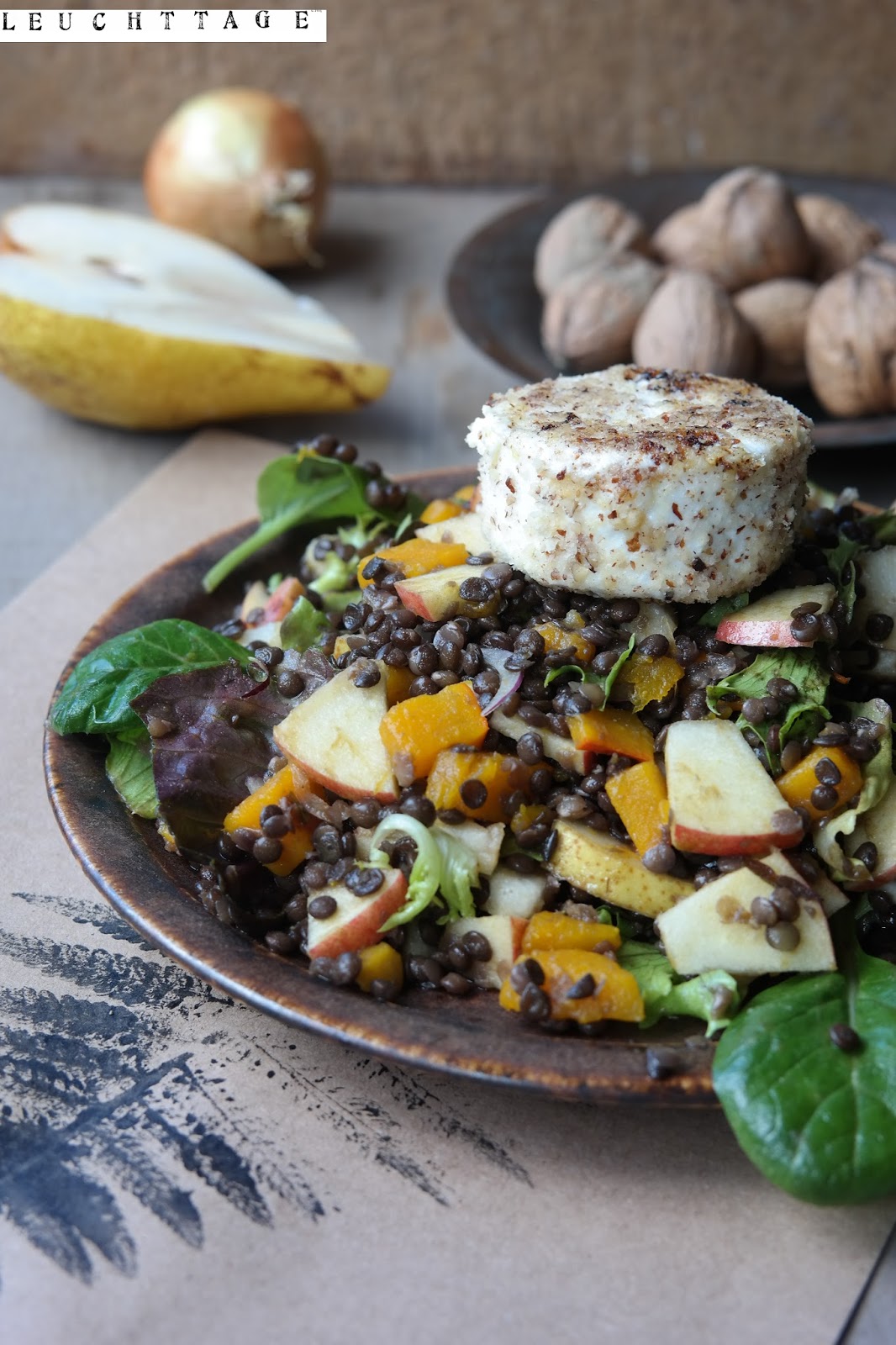 Linsen nach Packungsanweisung garen, zwischenzeitlich Öl, Essig, Apfelsaft mit Honig und Senf verquirlen. Gegarte warme Linsen mit dem Dressing vermischen und Apfel-und Birnenwürfel unterheben. Kürbis in wenig Wasser bissfest garen und untermischen, das ganze ca. 1 Stunde marinieren lassen. Danach Ziegenkäsetaler in Nüssen wenden und in wenig Öl auf beiden Seiten anbraten. Salat unter das Linsengemüse heben und abschmecken. Mit Ziegenkäsetalern auf Tellern schön anrichten- enjoy !