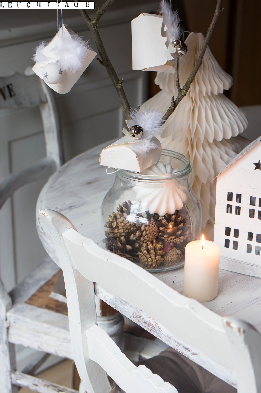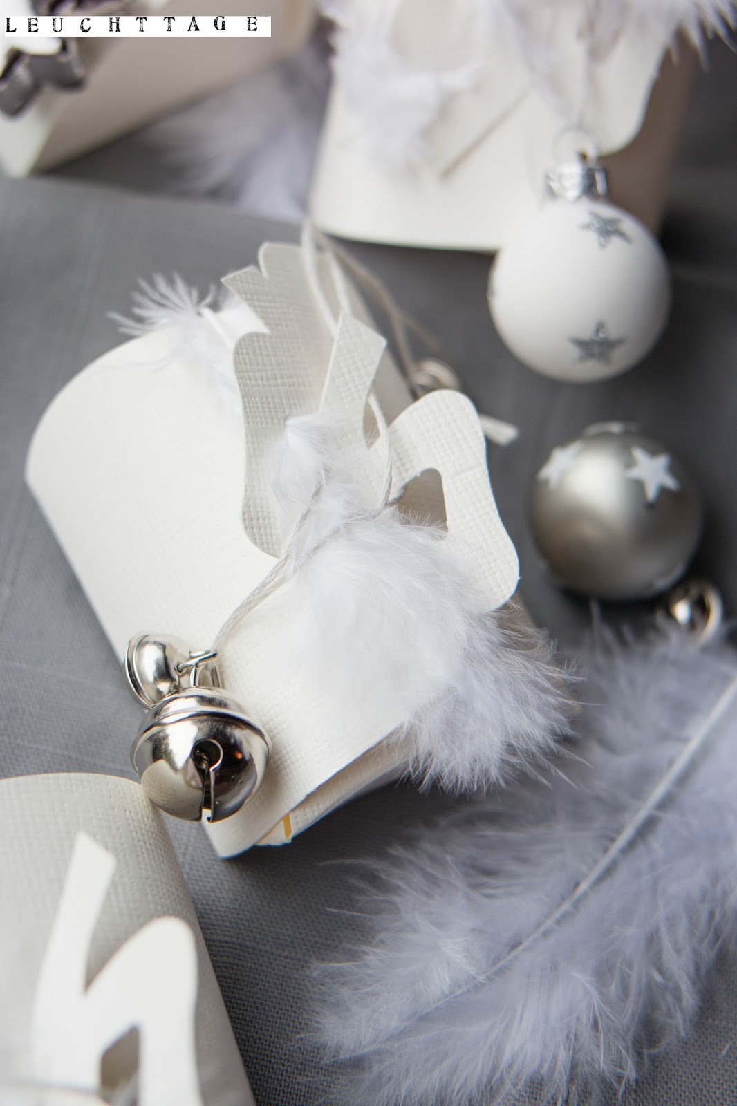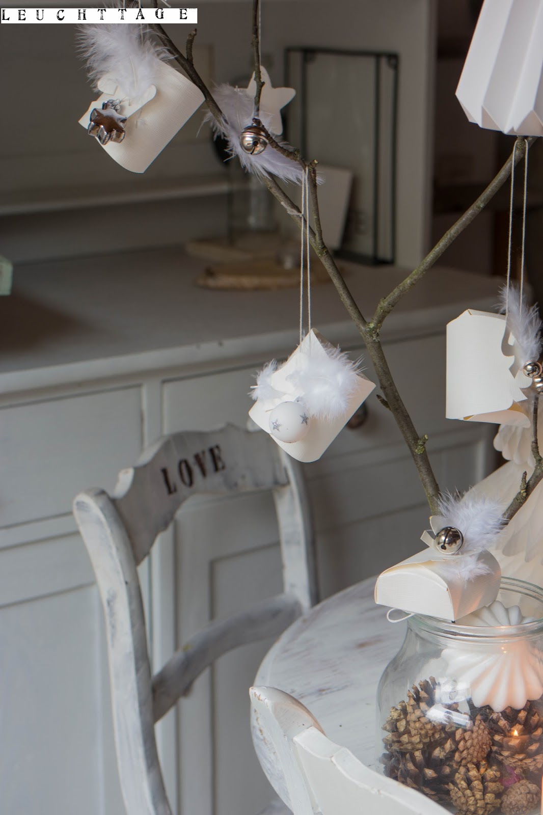 Silberschnüre zurechtschneiden und nach Belieben Anhänger oder Glöckchen auffädeln. An den Geschenkschachteln anbringen und mit einer Schlaufe verschließen. Federn in die Schachteln stecken. Schachteln nach Belieben an einem Ast befestigen- ich habe meinen in eine Glasvase gestellt und unten mit Knete befestigt für besseren Halt- das ganze noch mit Eicheln und weißen Sternen aufgefüllt und von der Knete ist keine Spur mehr zu erkennen 🙂
