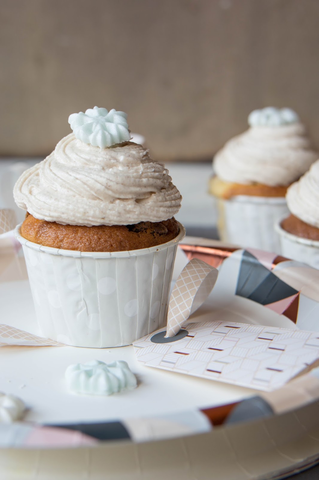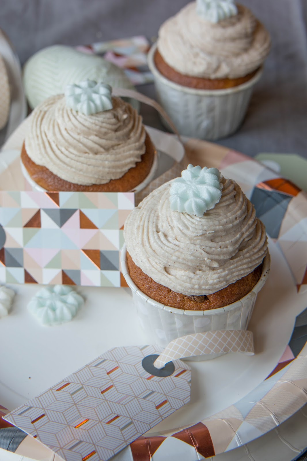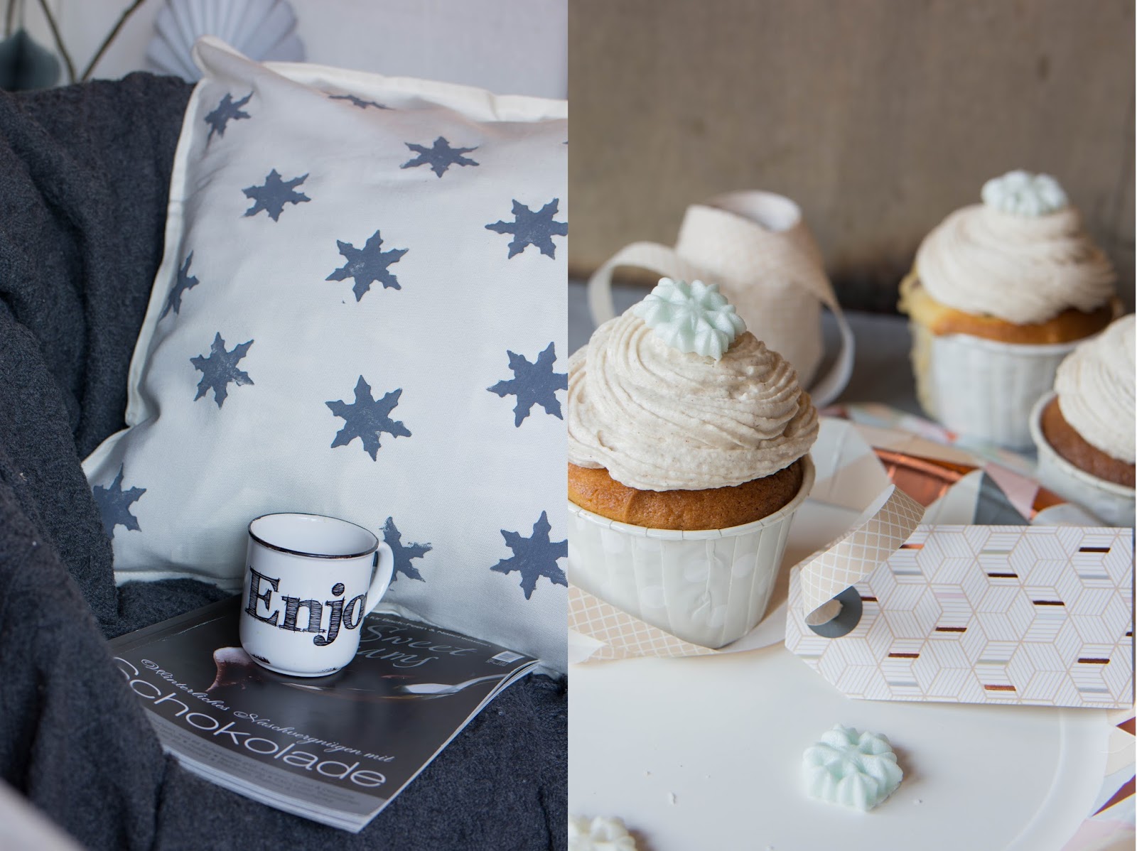 Für das Topping Butter und Puderzucker schaumig cremig rühren ( 5 Minuten), danach Frischkäse Eslöffelweise unterarbeiten ( wichtig: der Frischkäse sollte Zimmertemperatur haben, sonst könnte die Creme gerinnen !). Zimt unterrühren. In Spritztülle füllen und auf die Cupcakes spritzen. Mit Fondant Eiskristallen garnieren