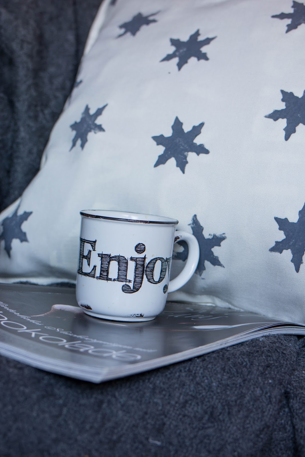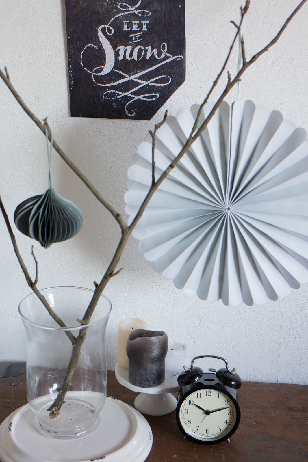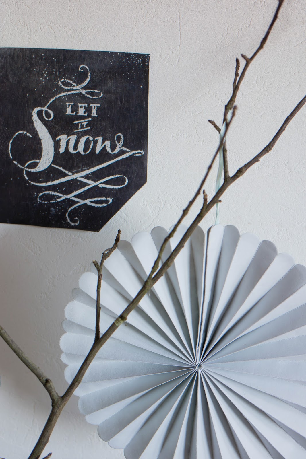 Das erhalte ich mir alternativ mit luftig anmutenden Papierrosen und bedruckten Schneeflockenkissen. Die sind easy-peasy selbstgemacht- Kartoffelstempel mit Schneeflockenausstecher herstellen, mit grauer Stofffarbe ( wow- drei f !) bepinseln und auf weißes Kissen drucken.