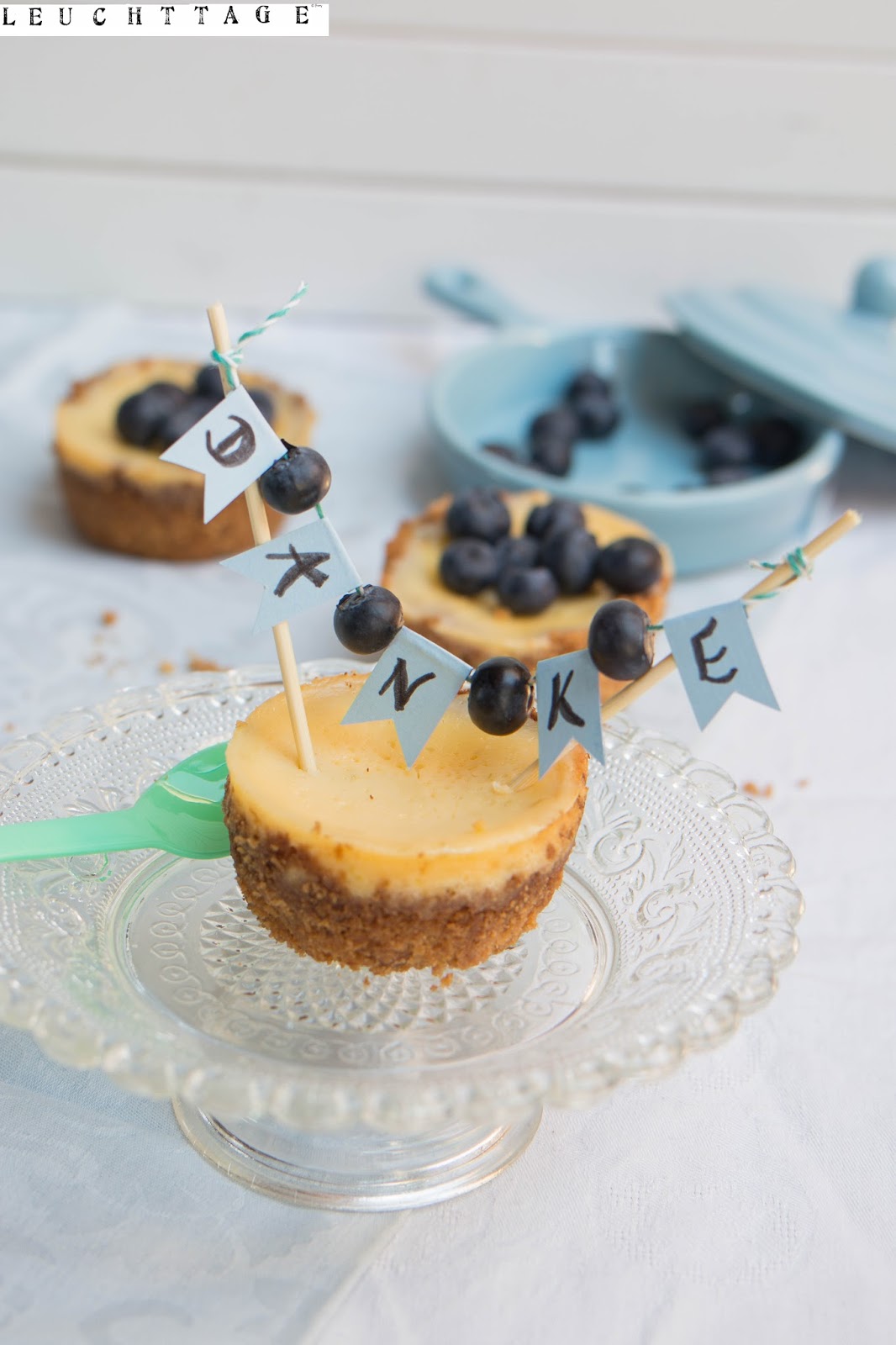 Heidelbeeren und kleine Wimpel mit Buchstaben abwechselnd auf Garn fädeln und an Zahnstochern befestigen, auf den Törtchen anbringen