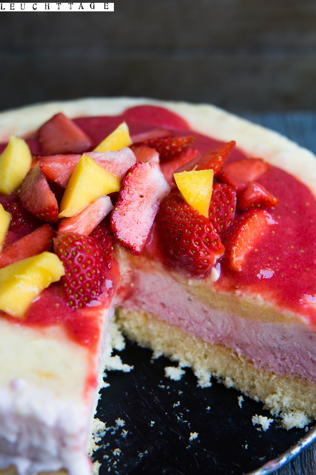 Mango und Erdbeere feiern in der Torte ein kleines Fest- und yeahh, unser Bauch dadurch auch 🙂