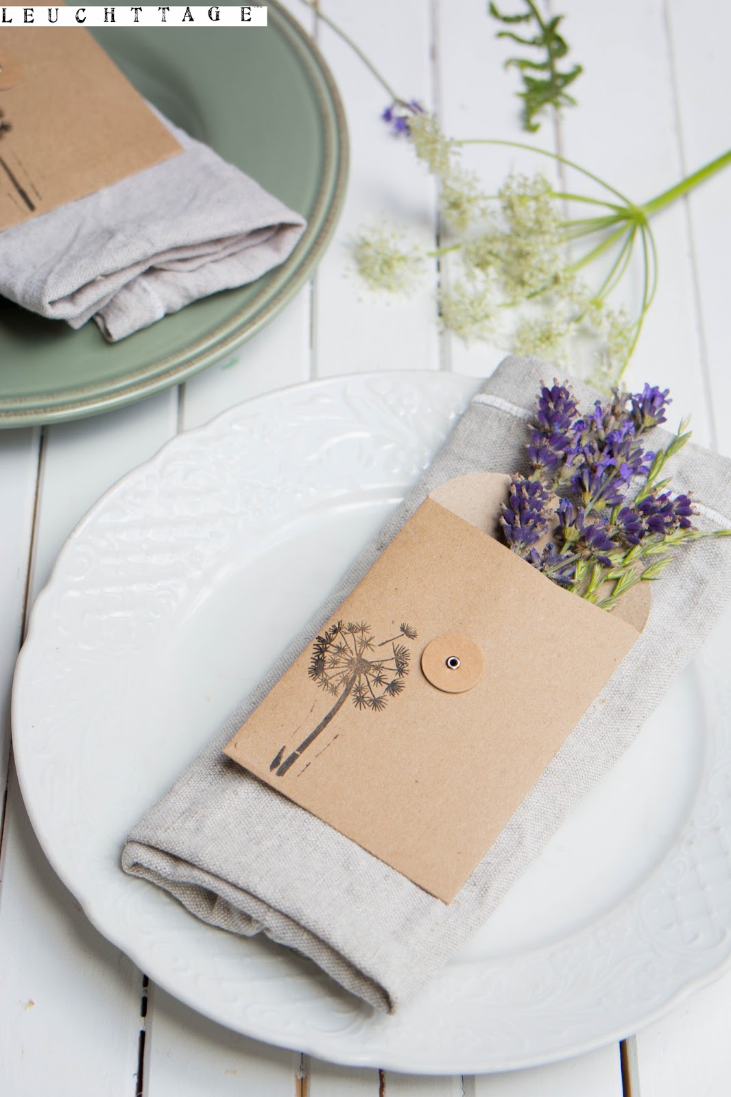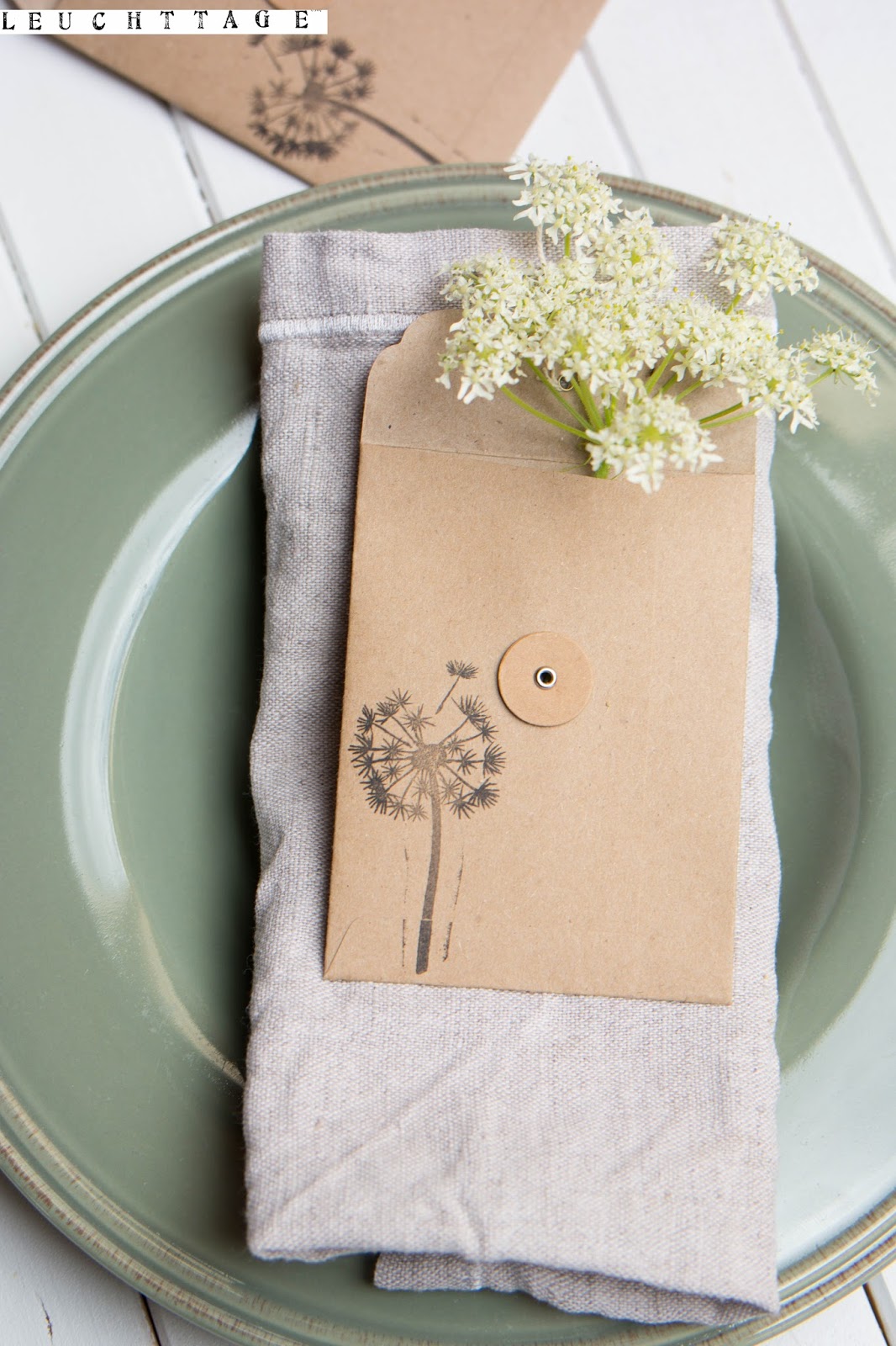Deshalb haben es frische Blümelis auch in meine einfache Tischdeko geschafft. Kraftpapier mit Kordeln, welches ihr z.B . hier bekommt, wird mit schönsten Naturstempeln, wie es sie hier zu finden gibt, bestempelt.