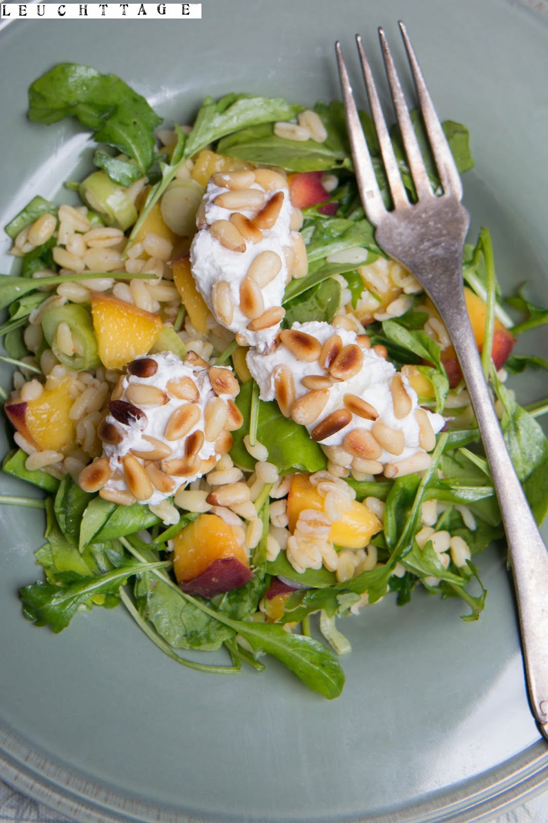 Lauchzwiebel und Pfirsiche unter den Salat heben.