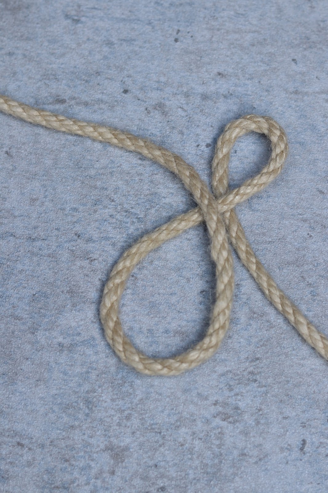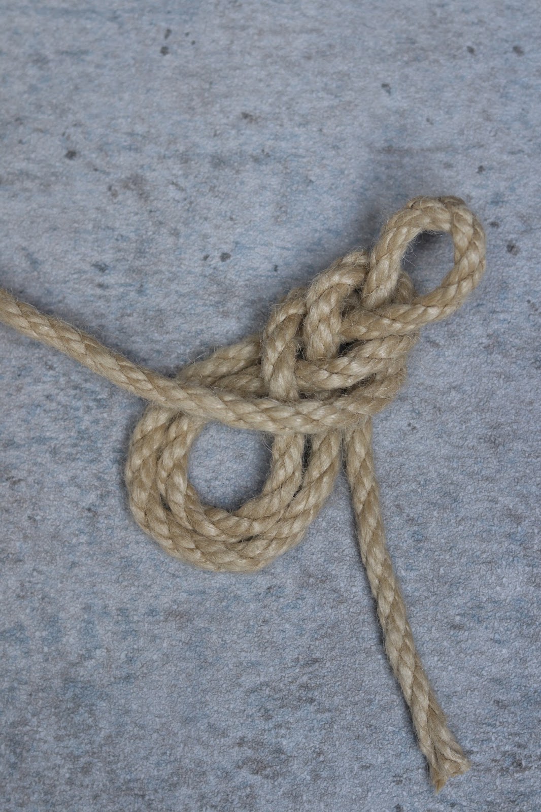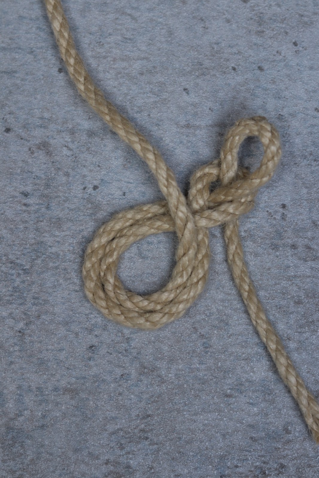 Wie auf dem ersten Bild unten links eine Schlaufe legen- der untere, nach rechts zeigende Teil steht ca. 10 cm über, der lange Rest des Seiles zeigt nach links.