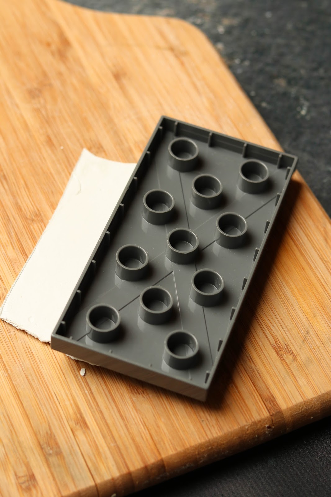 Duplo-oder Legoplatte auf die ausgewellte Masse legen und mit leichtem Druck auf die Unterlage drücken, so dass das Muster der Platte hineingedrückt wird.